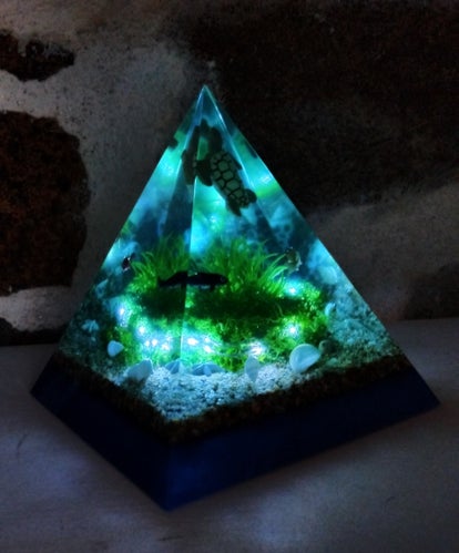 Magnifique pyramide d'une hauteur de 14cm et d'une base carrée de 14cm pour un poid total de plus de 1 kg! Une très belle pyramide représentant un fond marin avec une tortue, des poissons, de la végétation, coquillages et véritable sable sur fond bleu assorti.