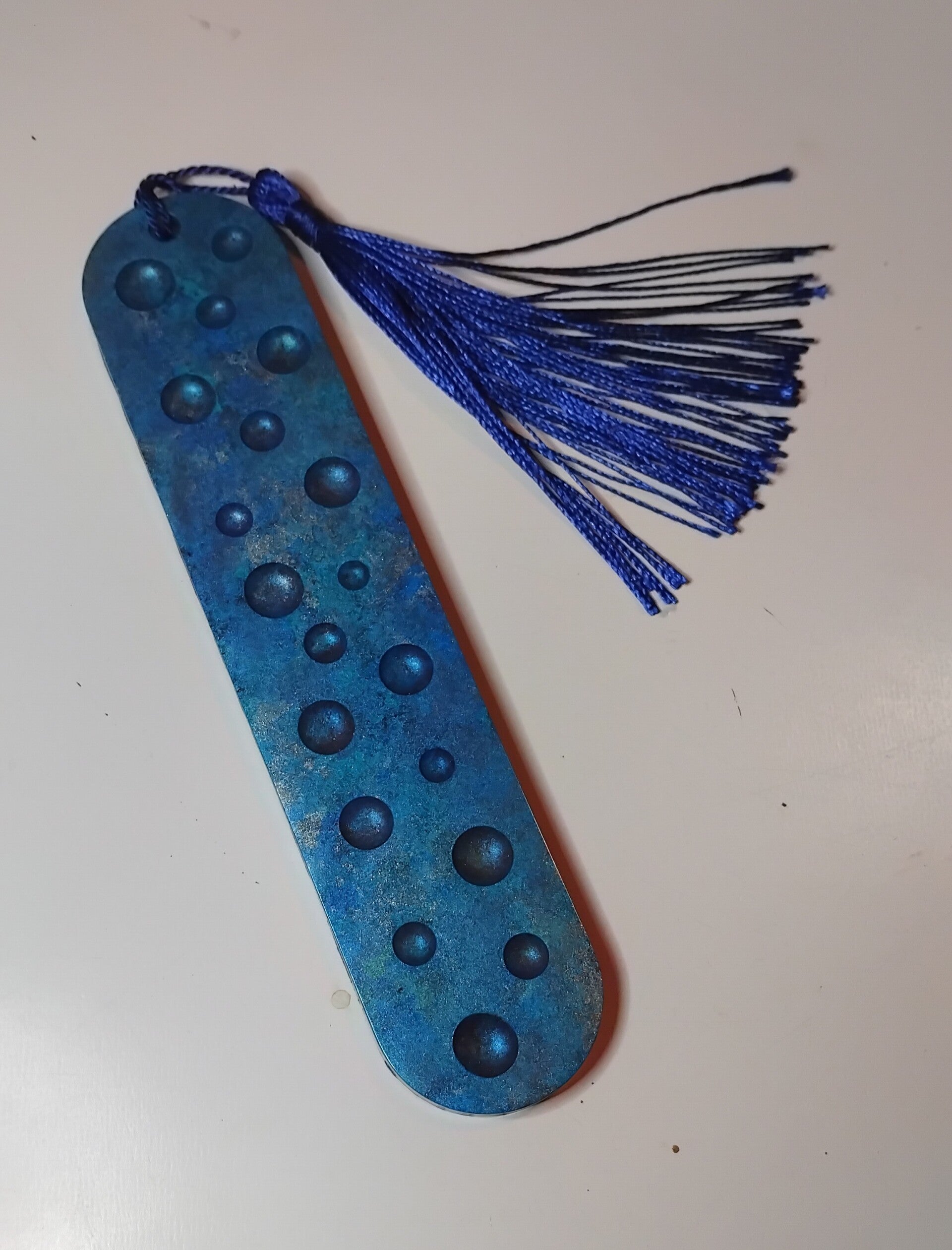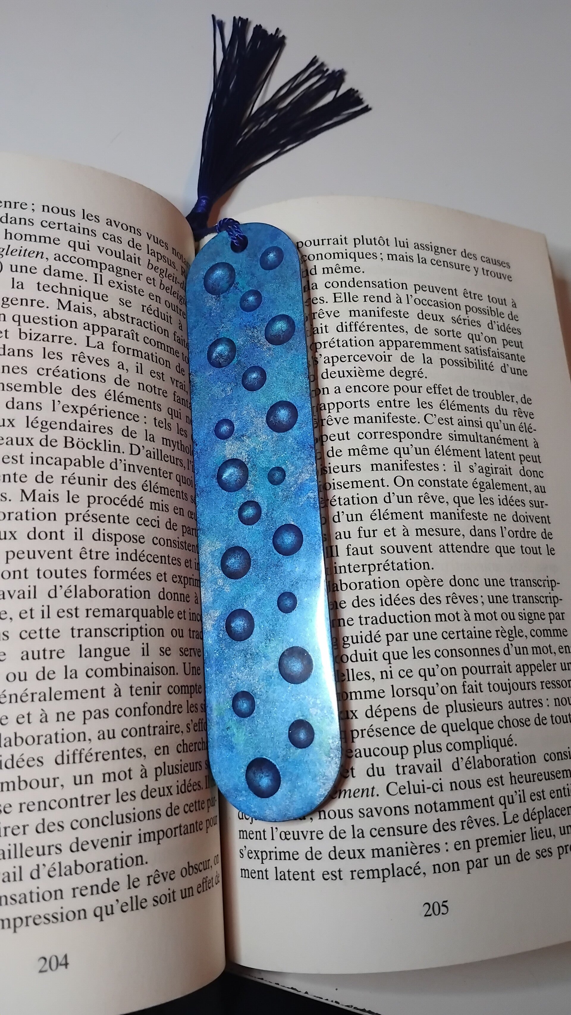 Marque-page ovale "gouttes d'eau" mélange de bleu métallisé et pompon bleu.