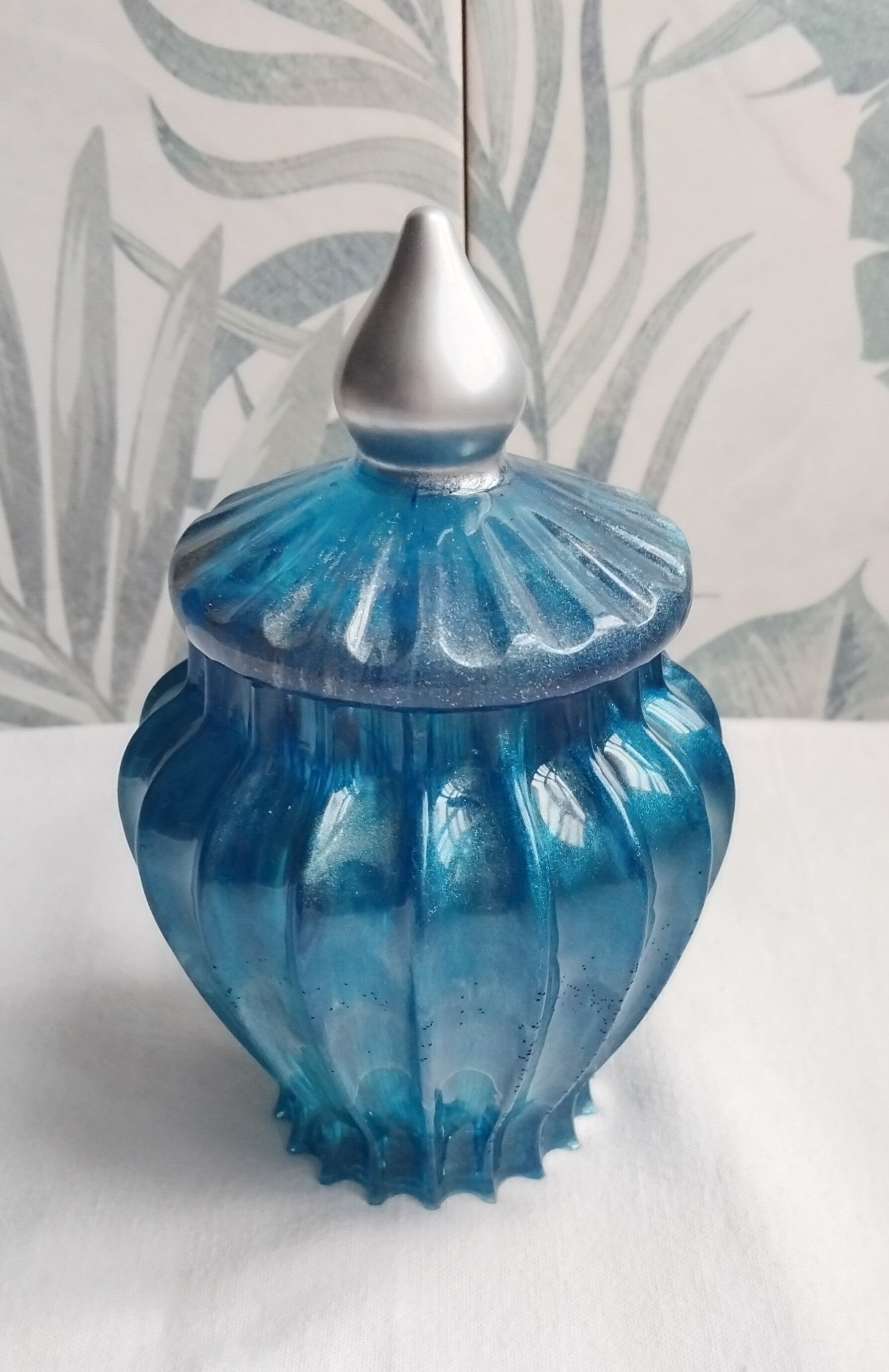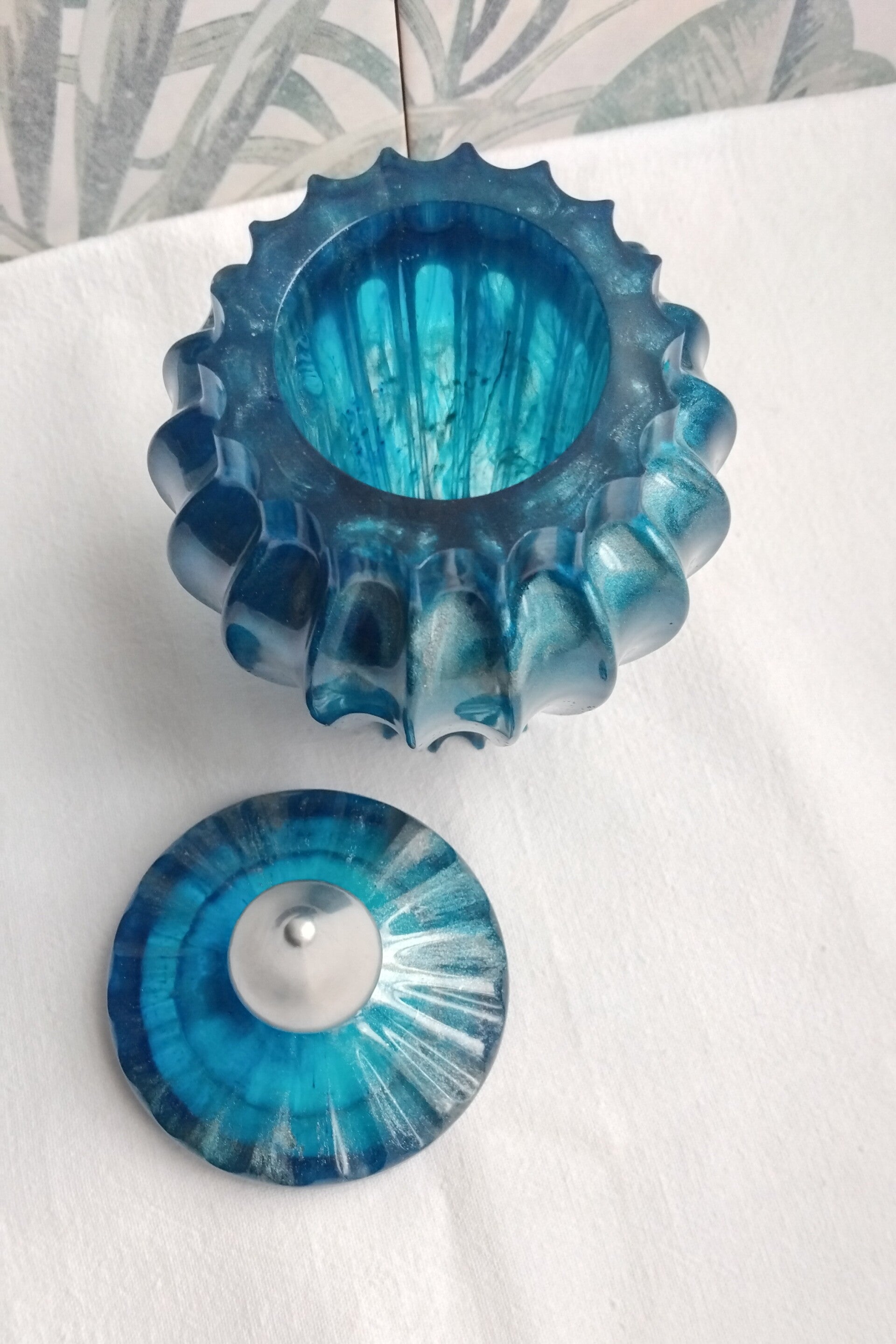 Boîte en relief en forme de pointe, couleurs bleus et argent, tout en transparence, qui trouvera facilement sa place dans une sdb ou sur une coiffeuse.
