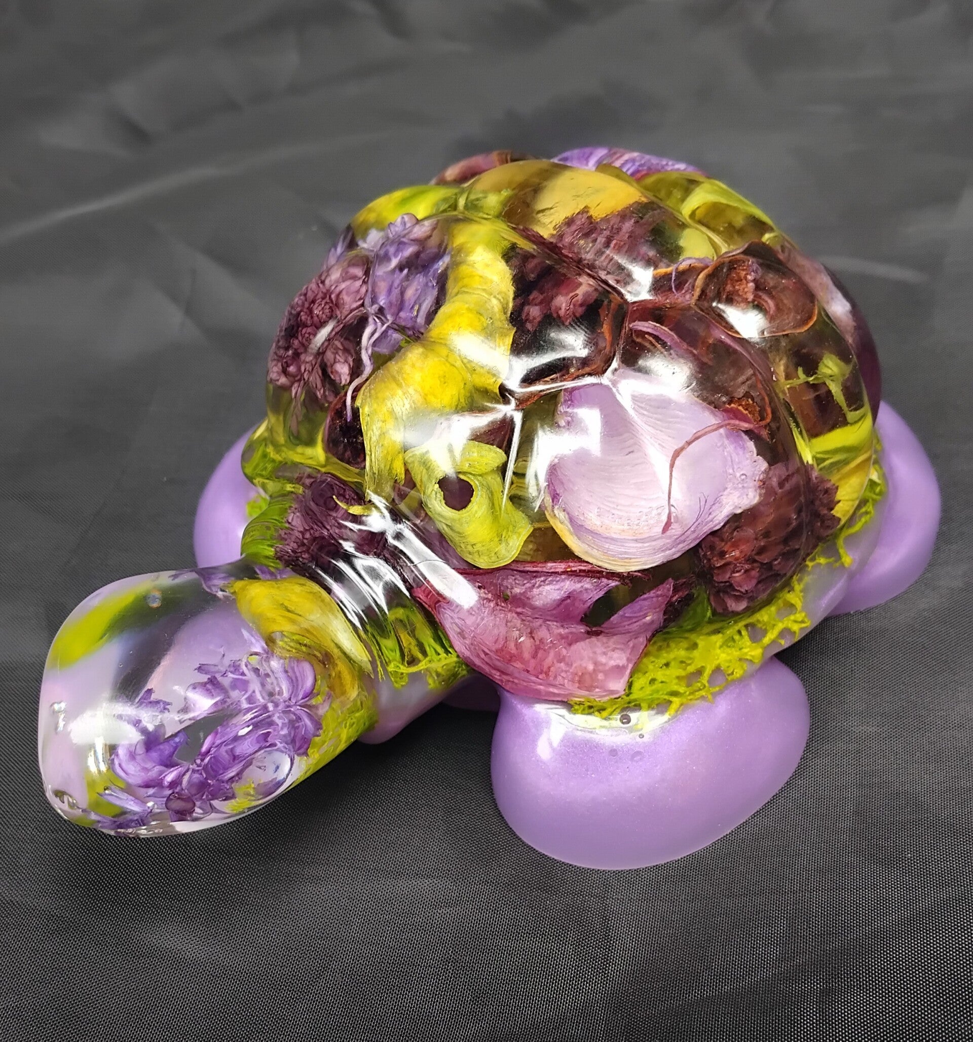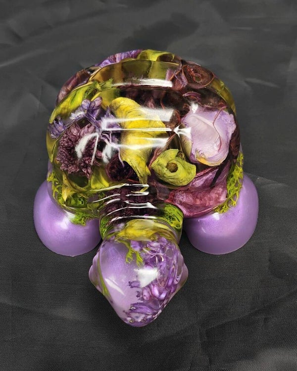 Tortue végétale au mélange de couleurs vert anis et violet.