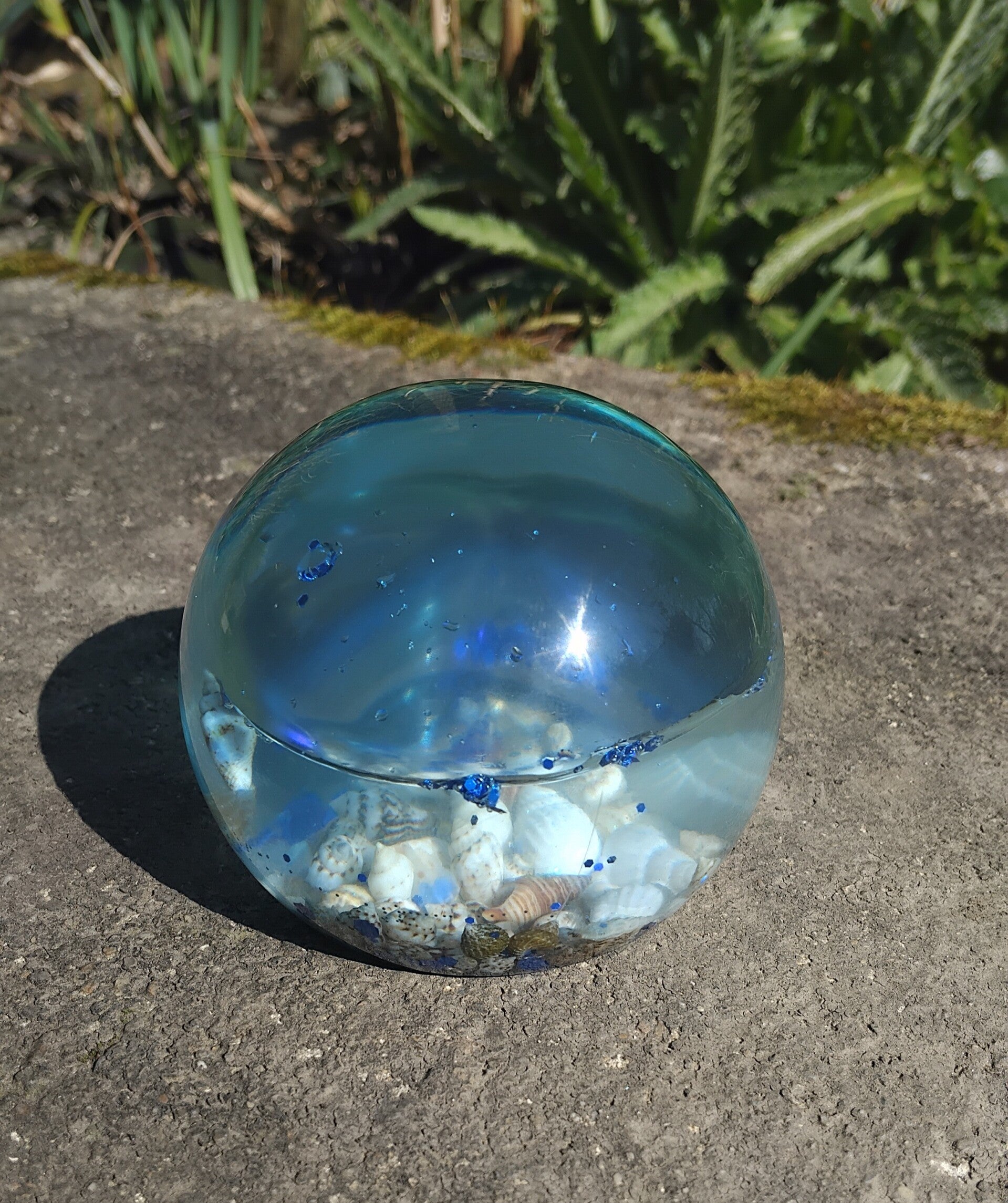 Boule shaker thème mer. Superbe boule effet "boule à neige mais sans neige!" avec liquide à l'intérieur remplie de coquillage et de paillettes. Base plate pour la poser ou vous le souhaitez.