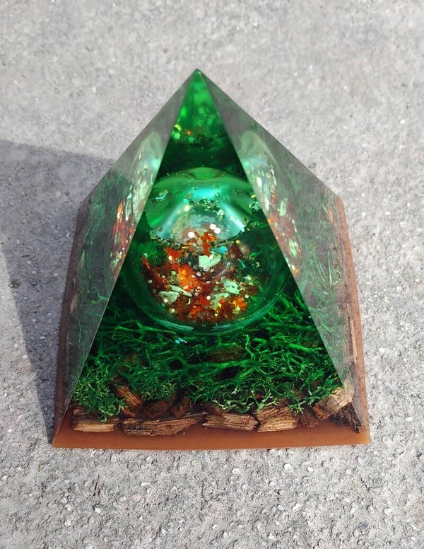 D'un joli vert translucide pour la partie haute, cette pyramide possède une boule d'eau à l'intérieure, remplie de feuilles d'érables cuivrées, de paillettes or et de feuilles verts tendres. Ce qui fait d'elle une pyramide shaker: Remuez-la et vous verrez toute sa déco à l'intérieur bouger!