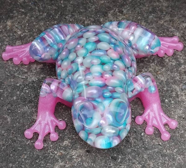Grenouille deco billes: roses, bleues et blanches nacrées métallisées fond rose métallisé assorti.