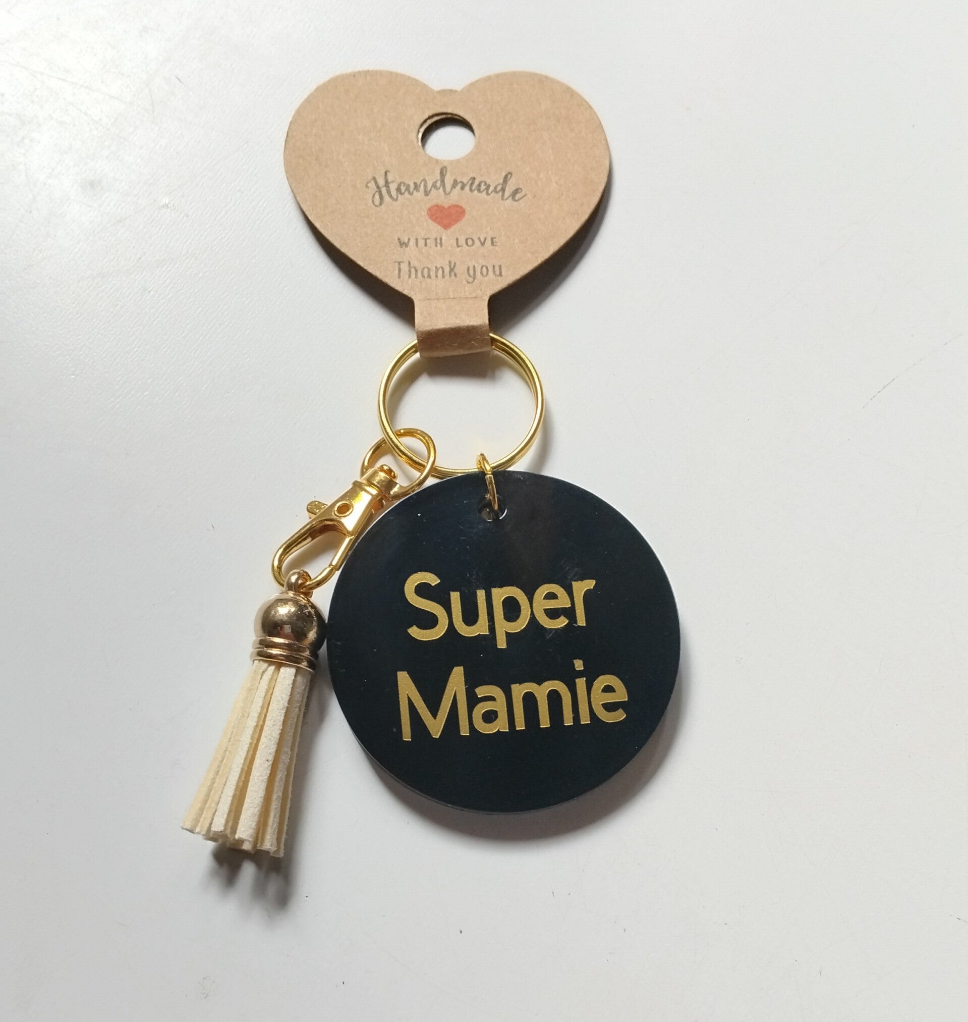 Porte-clés en métal doré "Super mamie" inscription or sur fond noir et pompon ivoire.