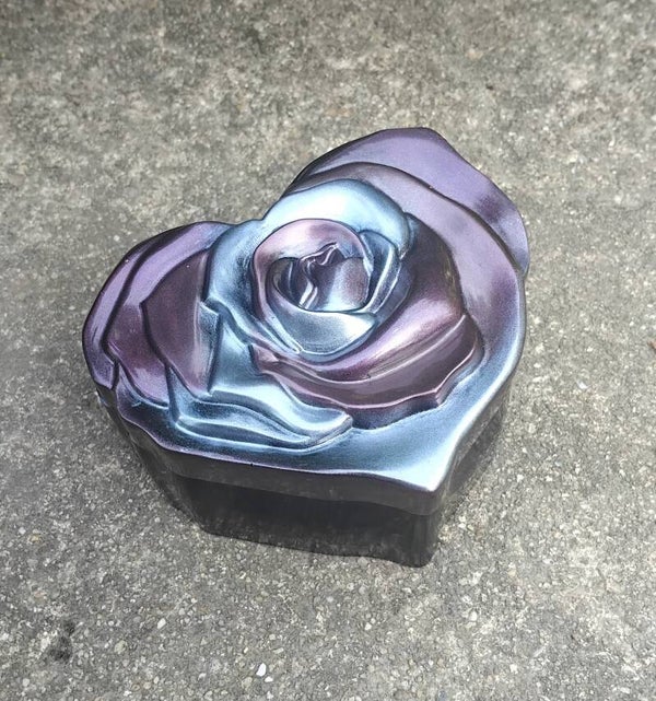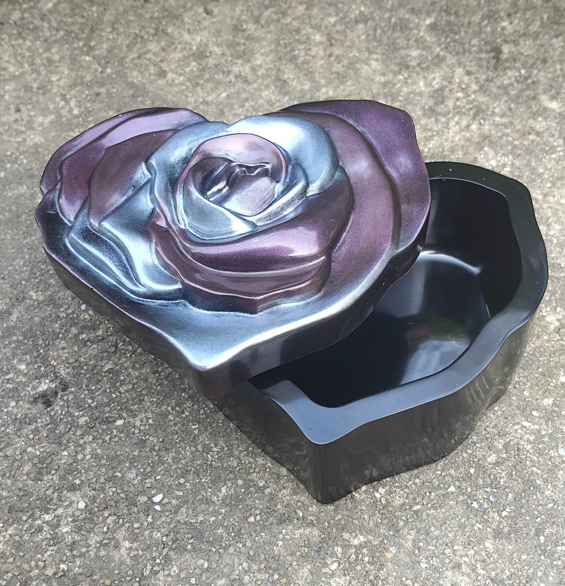 Jolie boîte à bijoux ou à trésors... Forme coeur avec une jolie rose en 3D pour le couvercle. Rose de couleurs rose, rouge et argentée métallisé et reste de la boîte noir.