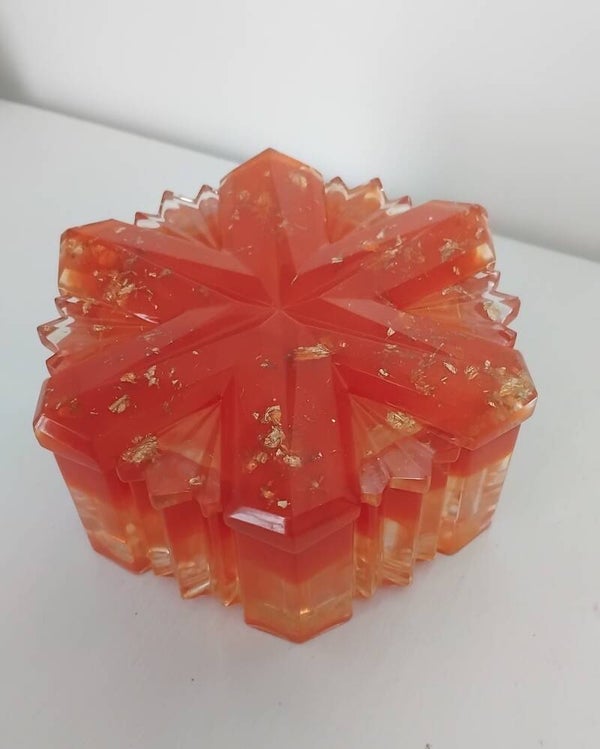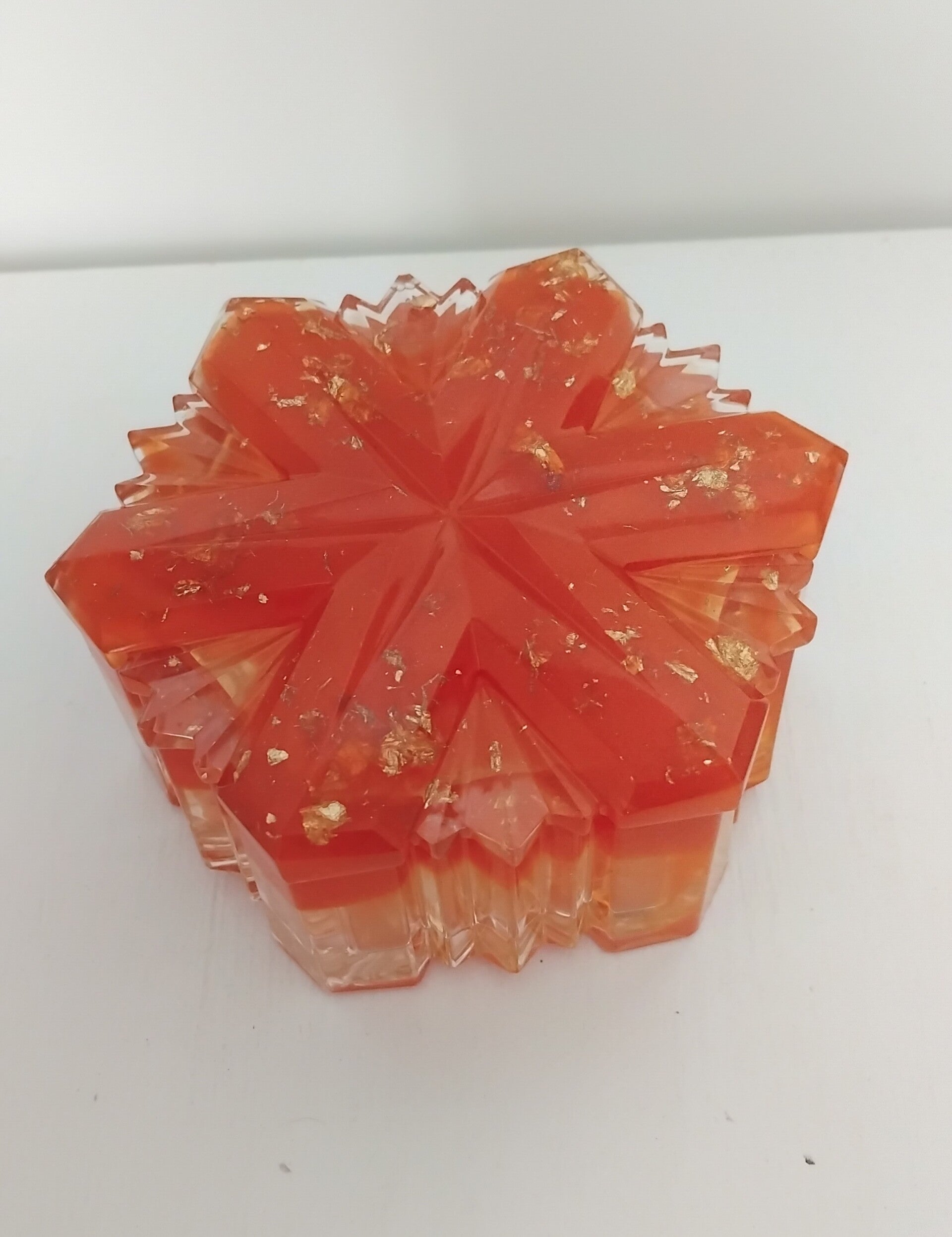 Jolie boîte à bijoux ou à trésors... En forme d'étoile style flocon de neige avec relief, de couleur rouge orangé et transparent feuille d'or.