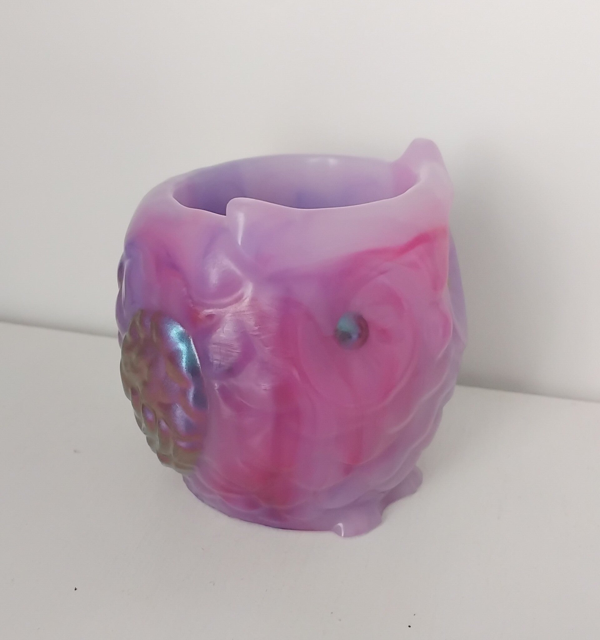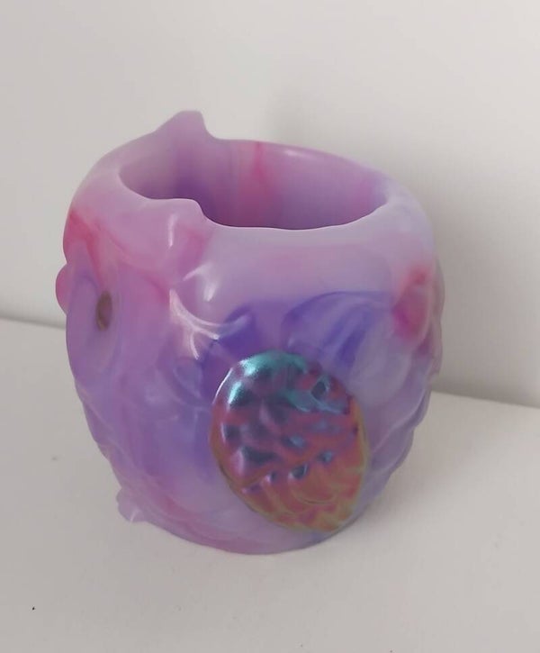 Pot "Chouette" rose et violette + violet caméléon (reflet essence) pouvant servir de pot à crayons sur le bureau, de pot à maquillage dans la salle de bain ou encore de pot pour une mini plante, plusieurs utilités possible pour cette création!