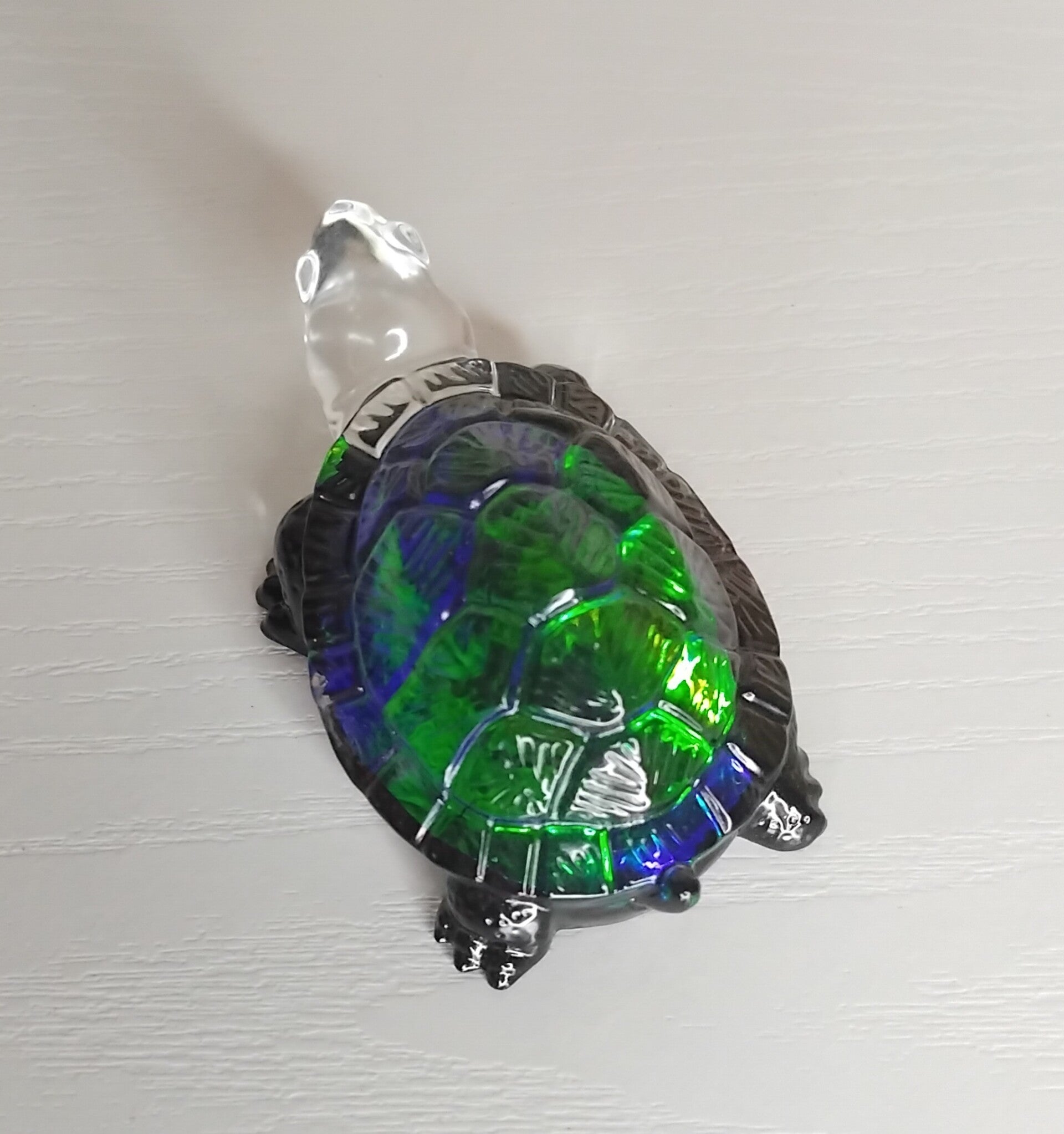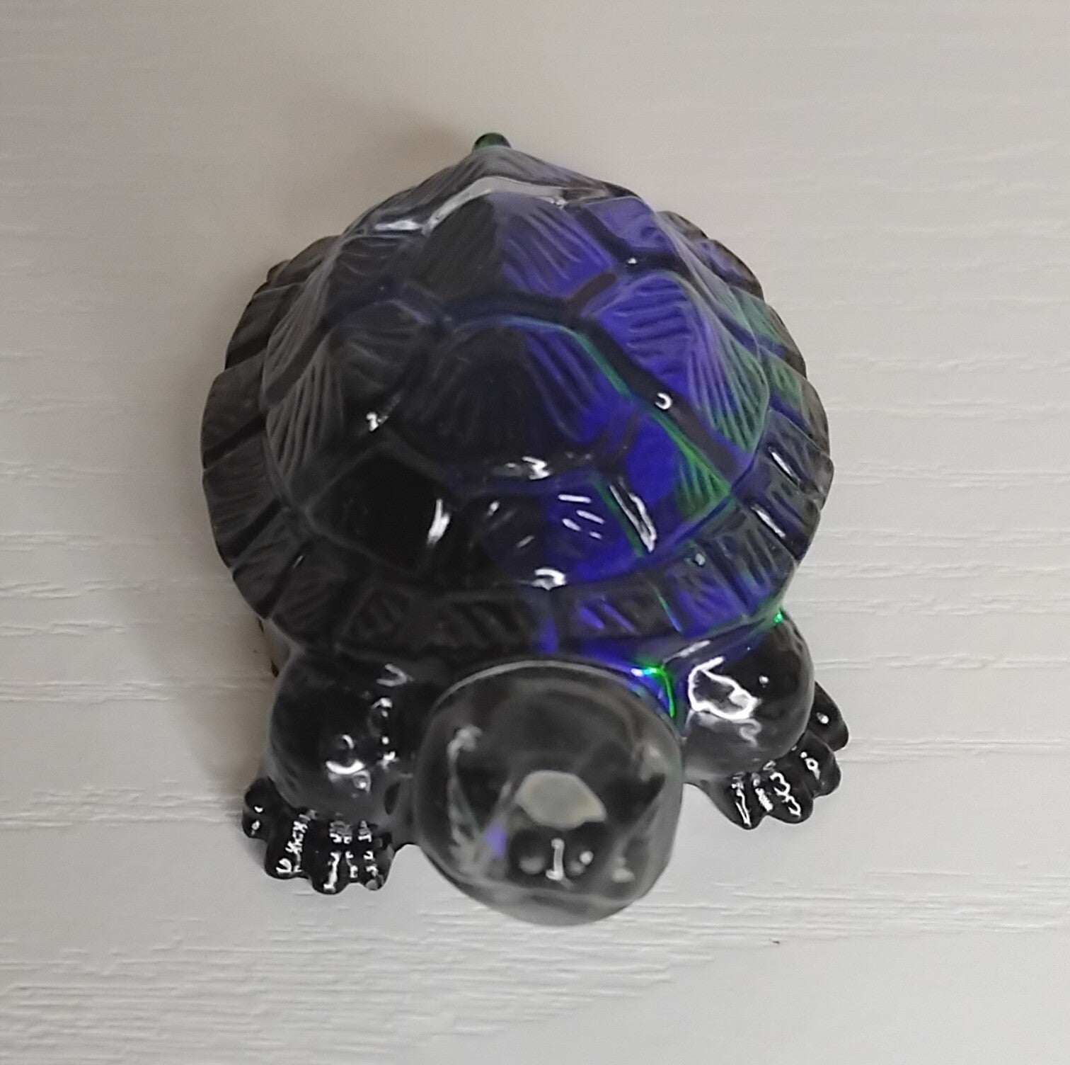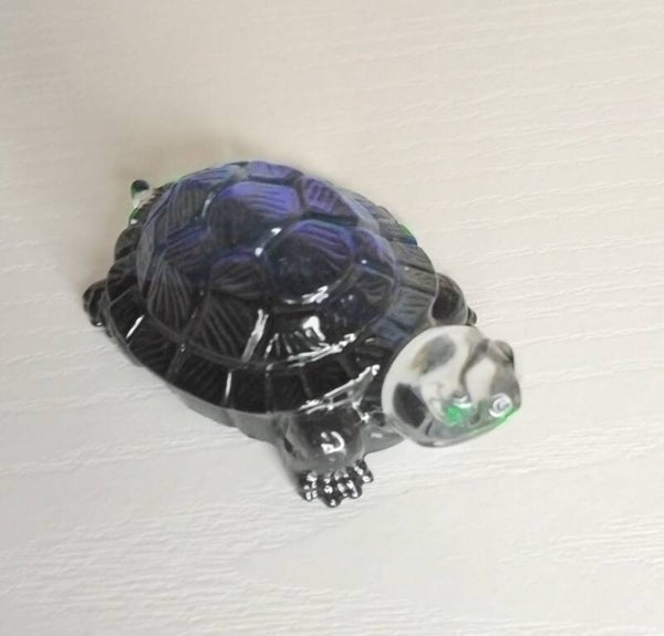 Tortue relief holographique verte et bleue sur fond noir.