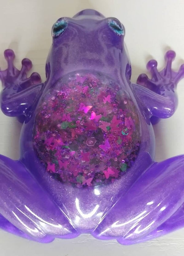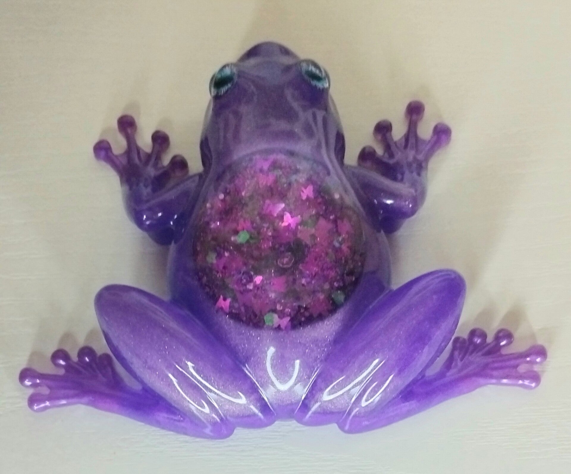 Grenouille SHAKER: avec bulle d'eau à l'intérieur, remplie de paillettes et de petits papillons couleurs roses et cristal. Le reste de la grenouille est de couleur violette métallisé et elle a de jolis yeux bleus et violets assortis.