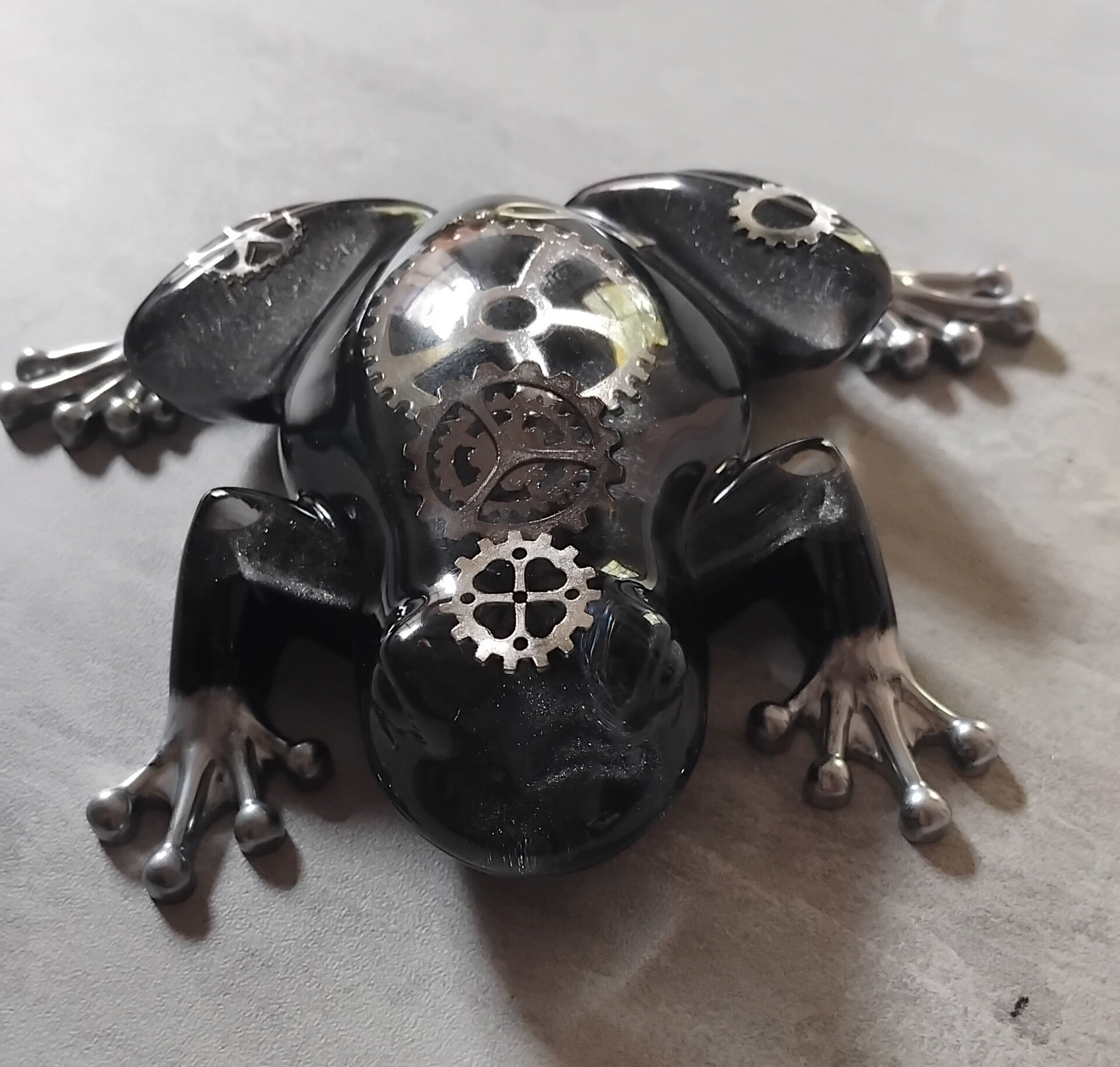 Grenouille réalisée avec des engrenages style mécanisme d'horloge de couleurs argentés sur fond noir métallisé et pattes argentés.