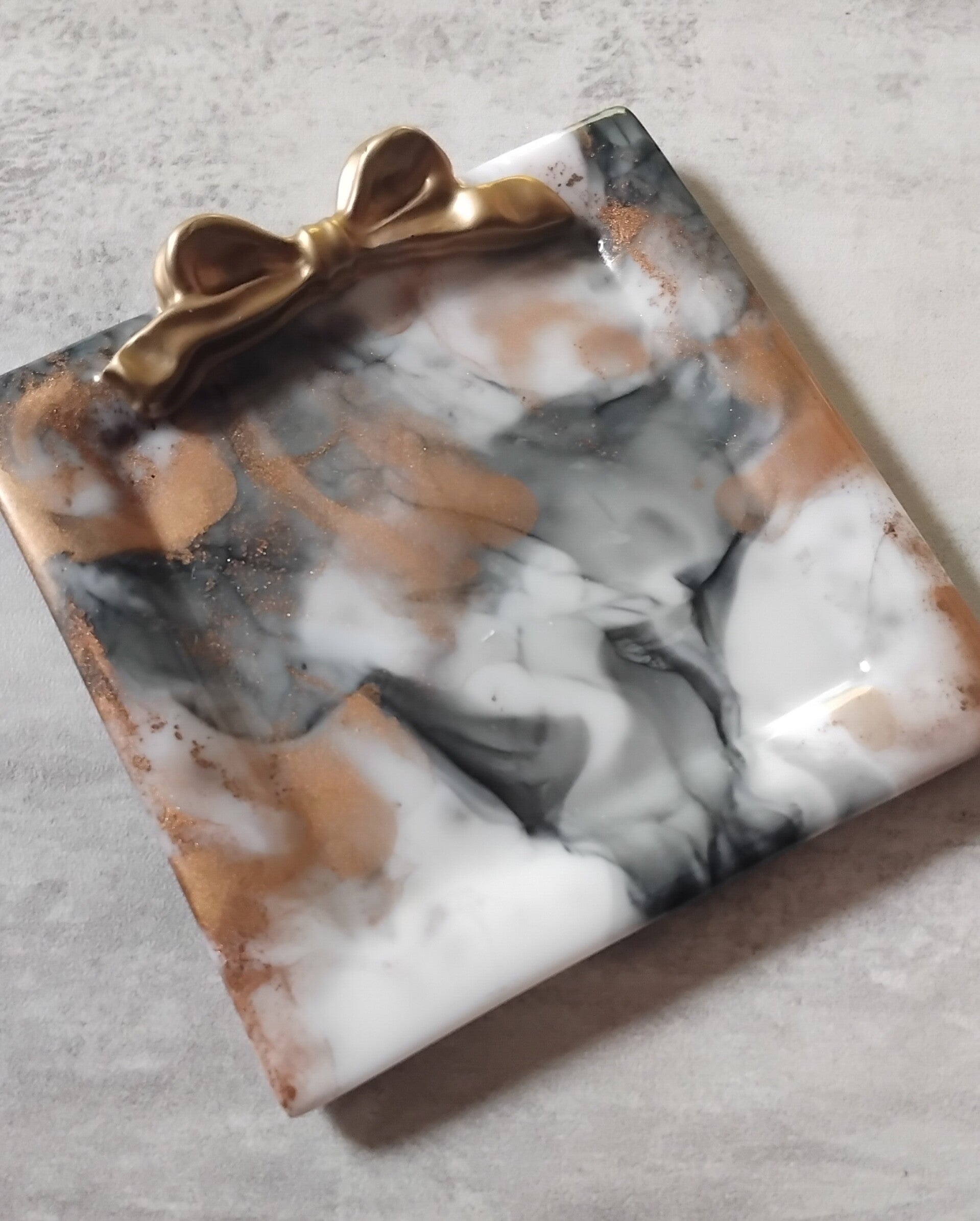 Vide poche carré 9,8 cm de côté marbré noir, blanc et or. Nœud or. Superbe rendu! 🙂