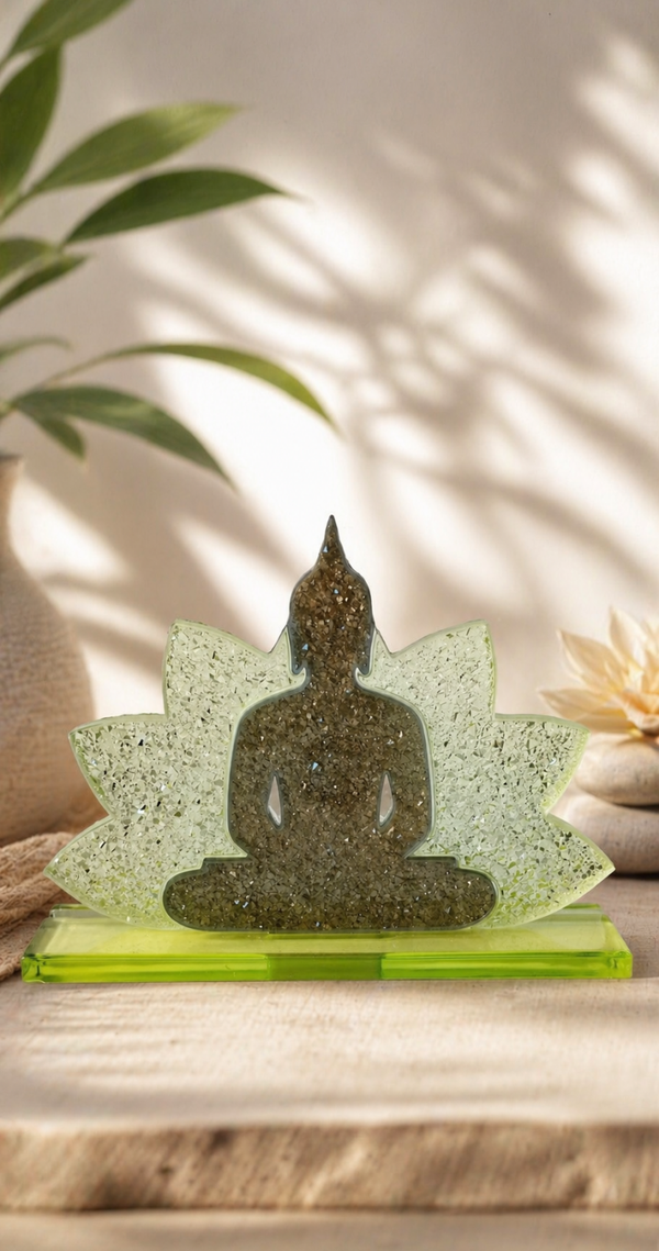 Couleurs : fleurs de lotus, vert clair transparent et bouddha or métallisé.